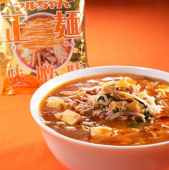 - 麺が茹で上がる直前に火を止め、絹ごし豆腐、水溶き片栗粉を入れ、ひと煮立ちさせます。とろみがついたら、麺を箸で押さえながら丼にスープを加えてよくかき混ぜます。
