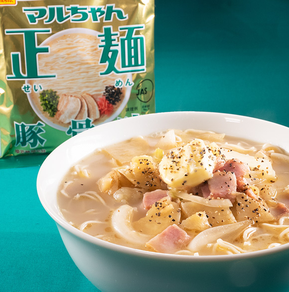 - 麺を丼に移し、スープを麺が絡むように軽くなじませたら、3を乗せ、バターを乗せ、黒こしょうをかけて完成です。